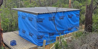 Interior lined, electrics in, walls insulated, wrapped, and roofed.